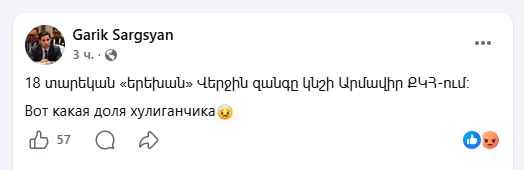 «18 տարեկան «երեխան» Վերջին զանգը կնշի Արմավիր ՔԿՀ-ում։ Вот какая доля хулиганчика», — գրել է ՔՊ-ական համայնքապետը։