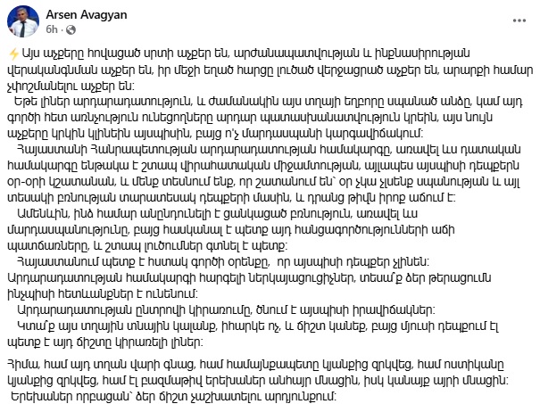 Արսեն Ավագյանը ֆեյսբուքյան իր էջում գրում է․