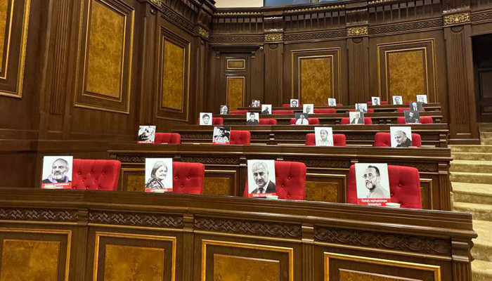 «Ազգային ճակատ»-ը թելեգրամյան էջում գրում է. «ԱԺ դահլիճն այս պահին: Կառավարության անդամների սեղաններին քաղբանտարկյալների նկարներն են: