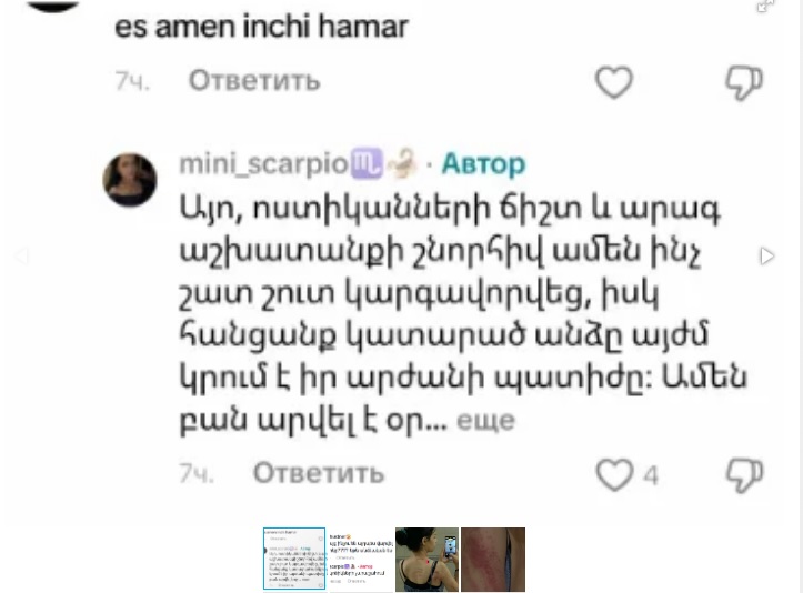 Դերասանուհին մեկնաբանությունների բաժնում նաև նշել է, որ «հանցանք կատարած անձն այժմ կրում է իր պատիժը»։