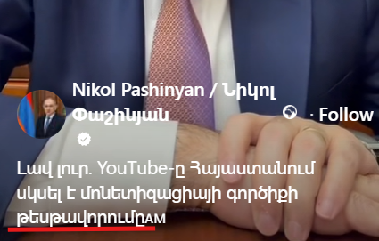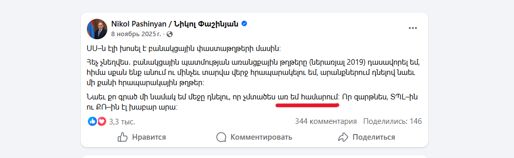 Թվում է, թե Փաշինյանն՝ ինքը պետք է իմանա այդ բառի ուղղագրությունը, սակայն պարզվում է, որ ինքն էլ չգիտի: Իր գրառումներից մեկում նա գրել է «առ համարել»:
