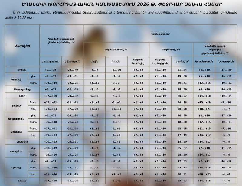 Փետրվարին օդի ամսական միջին ջերմաստիճանը կանխատեսվում է նորմայից բարձր 2-3 աստիճանով, տեղումների քանակը՝ նորմայից ավել 5-10մմ-ով։ Այս մասին հայտնում են «Հիդրոօդերևութաբանության և մոնիթորինգի կենտրոն» ՊՈԱԿ-ից: