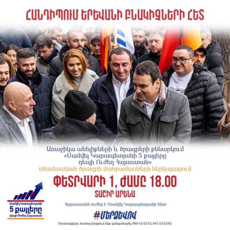 Փետրվարի 1-ին, ժամը՝ 18.00-ին, Տաշիր Արենայում տեղի կունենա «Մեր ձևով» ժողովրդական շարժման համակարգող Նարեկ Կարապետյանի և շարժման անդամների հանդիպումը երևանցիների հետ։