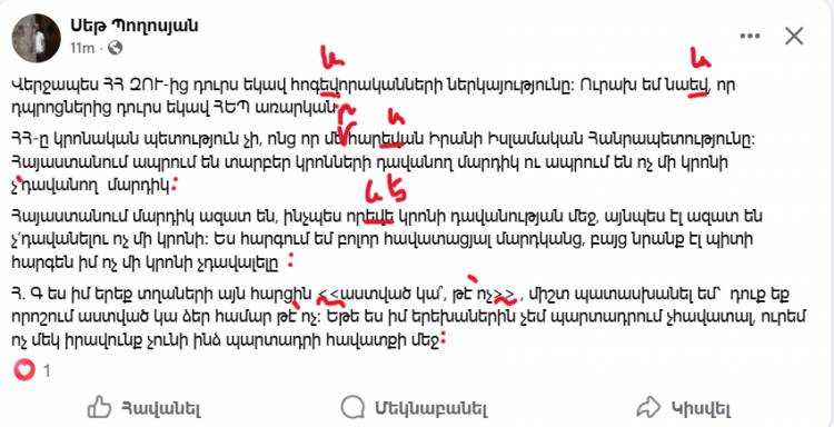 «Վերջապես ՀՀ ԶՈՒ-ից դուրս եկավ հոգևորականների ներկայությունը։ Ուրախ եմ նաև, որ դպրոցներից դուրս եկավ ՀԵՊ առարկան։ ՀՀ-ը կրոնական պետություն չէ, ոնց որ մեր հարևան Իրանի Իսլամական Հանրապետությունը։ Հայաստանում ապրում են տարբեր կրոնների դավանող մարդիկ ու ապրում են ոչ մի կրոնի չ’դավանող մարդիկ։