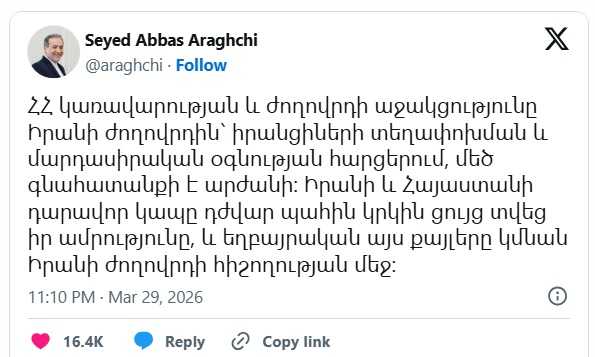 Министр иностранных дел Ирана Аббас Аракчи опубликовал в соцсети X запись на армянском языке, отметив содействие, оказанное Ереваном Тегерану.