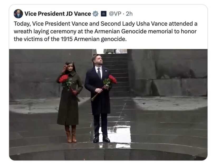 Вице-президент США Джей Ди Вэнс удалил со своей страницы в социальной сети X публикацию, посвящённую его визиту в мемориальный комплекс Цицернакаберд, в которой он дважды использовал формулировку «Геноцид армян».