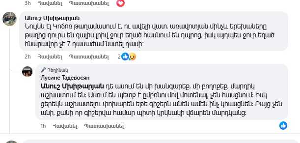 Նույնն էլ Կոճոռ թաղամասում է, ու ավելի վատ, առավոտյան մինչև երեխաները թաղից դուրս են գալիս՝ լրիվ ջուր եղած հասնում են դպրոց, իսկ այդպես ջուր եղած հնարավոր չէ 7 դասաժամ նստել դասի։